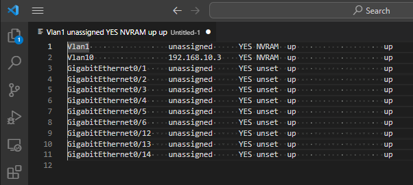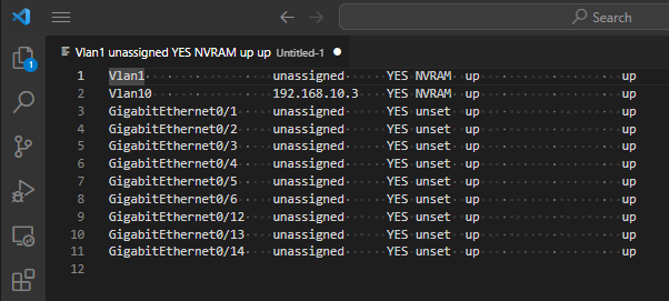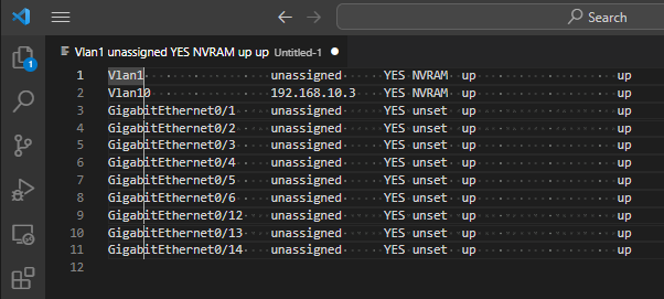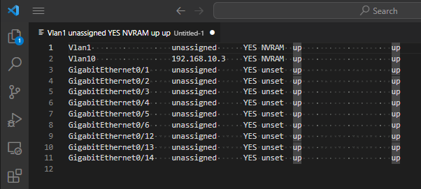 Let’s say you need a list of all interfaces that are in an up/up state on a switch or router. Each interface must be on its own line so that you can easily paste it into another application, like a spreadsheet in Excel. Some example output is below.