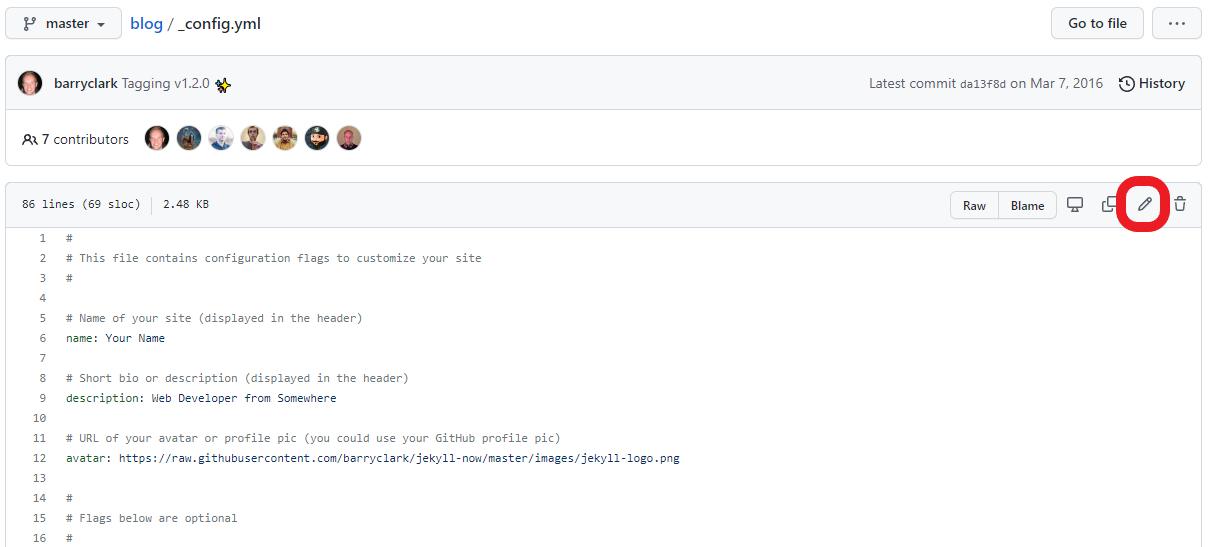 The contents of the _config.yml file will appear. Left click on the pencil icon near the upper right corner of the file contents to begin editing this file. An example is below with the pencil icon highlighted in red.