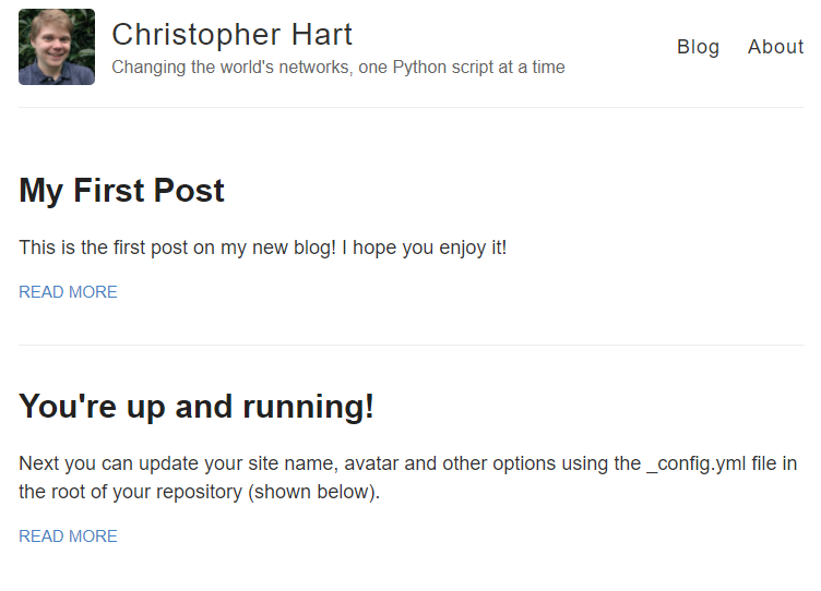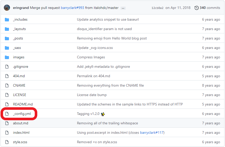 Next you can update your site name, avatar and other options using the _config.yml file in the root of your repository (shown below).