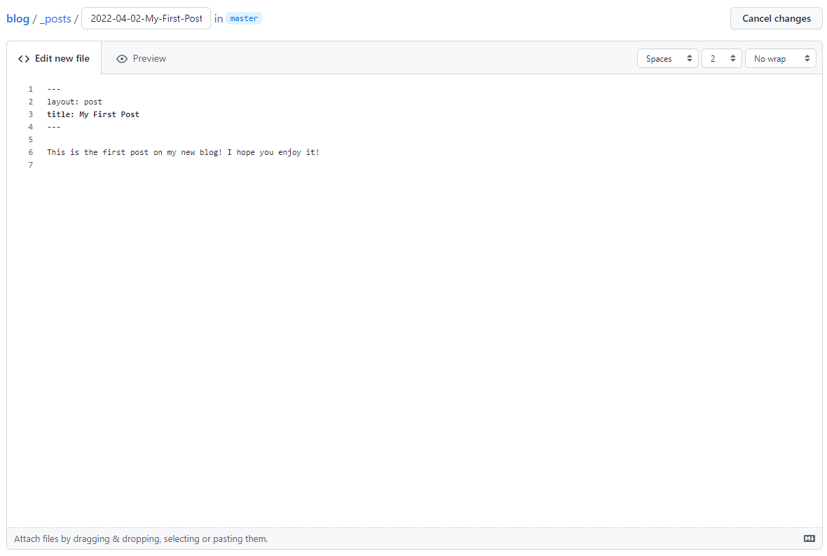 Scroll down to the bottom of the page and provide a brief description of the changes made to this file, such as “Create first post”. Then, click the green “Commit changes” button. An example is below with the “Commit changes” button highlighted in red.