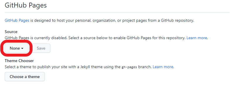 By default, GitHub Pages will be disabled for this repository. To enable it, we need to select a branch for GitHub Pages to build and serve our website from. In the middle pane under the “Source” section, left click on the “None” dropdown menu. An example is below with the “None” dropdown menu highlighted in red.