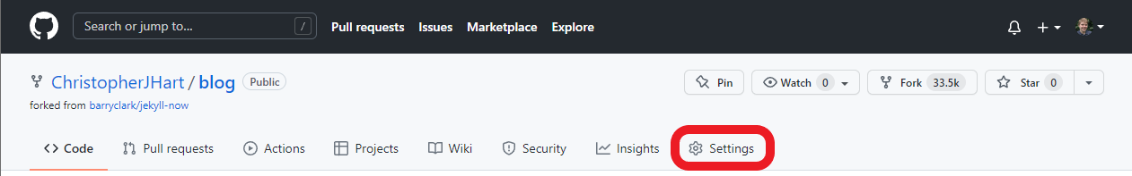 Next, we need to set up the GitHub Pages component of our blog. This will allow GitHub to automatically build and serve our website whenever changes are made to the underlying repository. First, left click on the “Settings” tab near the top of the repository. An example is below with the “Settings” button highlighted in red.