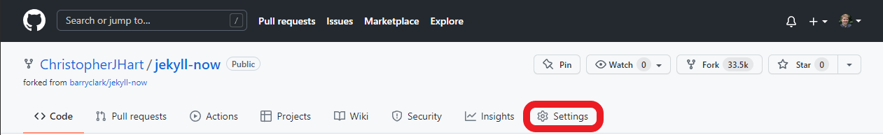 The jekyll-now repository name doesn’t accurately reflect the purpose of this repository, so we should rename it. Left-click on the “Settings” tab near the top of the repository. An example is below with the “Settings” button highlighted in red.