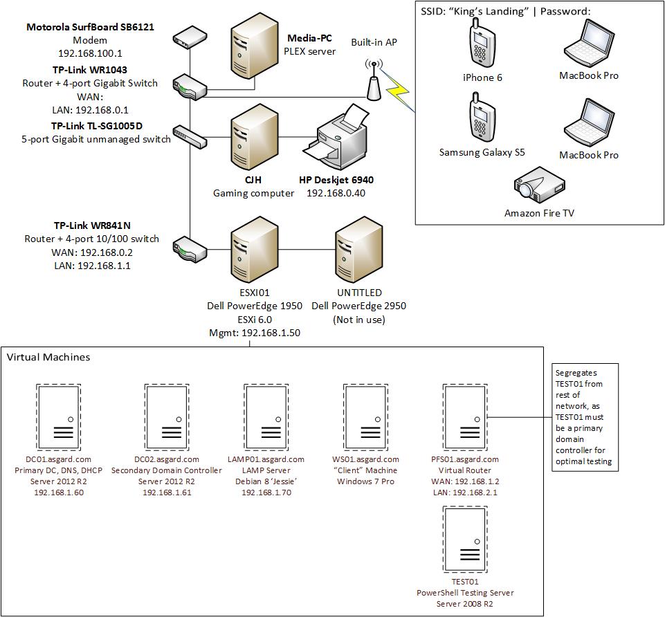 Not pictured in this diagram is a Cisco 3825 router and a Cisco WS-3750-24T-S (24-port gigabit L3 managed switch), both of which I have recently purchased and will be configuring next week. I’m very excited about acquiring these guys off of eBay, as they’ll let me clean up my network quite a bit by eliminating both TP-Link routers, the TP-Link switch, and by allowing me to easily virtualize the PLEX server and repurpose the media server for something else (something that I have technically been able to do ever since I acquired the Amazon Fire TV around Christmas.) It will also be my first opportunity to extensively play around with VLANs, and it will give me experience with Cisco equipment that I can apply towards a certification sometime in the near future.