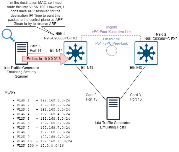 Card 3 Port 14 of the Ixia traffic generator emulates a security scanner. This port will send UDP packets towards random IP addresses in the 10.0.0.0/16 subnet associated with VLAN 100 sourced from 192.168.1.25 in VLAN 1. These packets are destined to the HSRP virtual MAC address, which means N9K-1 must route this traffic from VLAN 1 into VLAN 100. These packets will be treated as ARP Glean and will be punted to the control plane, as N9K-1 does not have ARP resolved for any IP address in the 10.0.0.0/16 subnet.