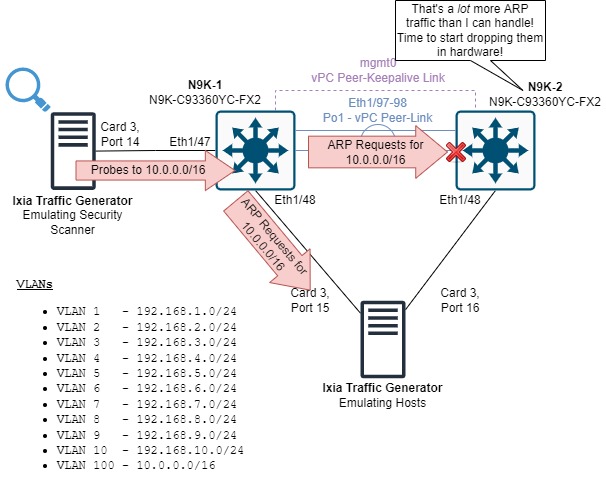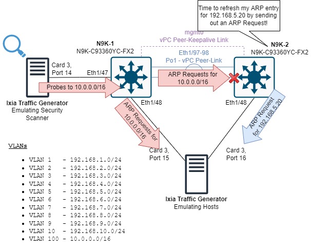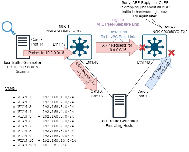 At first glance, this may not make sense. Both Nexus switches had a populated ARP table before the security scanner traffic started. When an ARP entry gets close to expiring, the Nexus should attempt to proactively refresh that entry by sending an ARP request for that IP to confirm the same IP/MAC binding is still valid. This traffic is ARP traffic, which should fall under the “copp-system-p-class-normal” CoPP class-map, not the Glean-focused “copp-system-p-class-l3uc-data”.