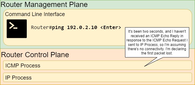 Recall that the original ICMP Echo Request packet was erased from memory by the IP Process. The ICMP Process has no knowledge of whether the ICMP packet it crafted and sent to the IP Processs was successfully sent out of the router by the IP Process, or if the ICMP packet was deleted in memory. The ICMP Process simply expects to receive an ICMP Echo Reply packet in response to the ICMP Echo Request packet it created within the defined timeout period (default 2 seconds in Cisco IOS-XE). When this timeout period expires, the ICMP Process will mark that instance of the ping unsuccessful.