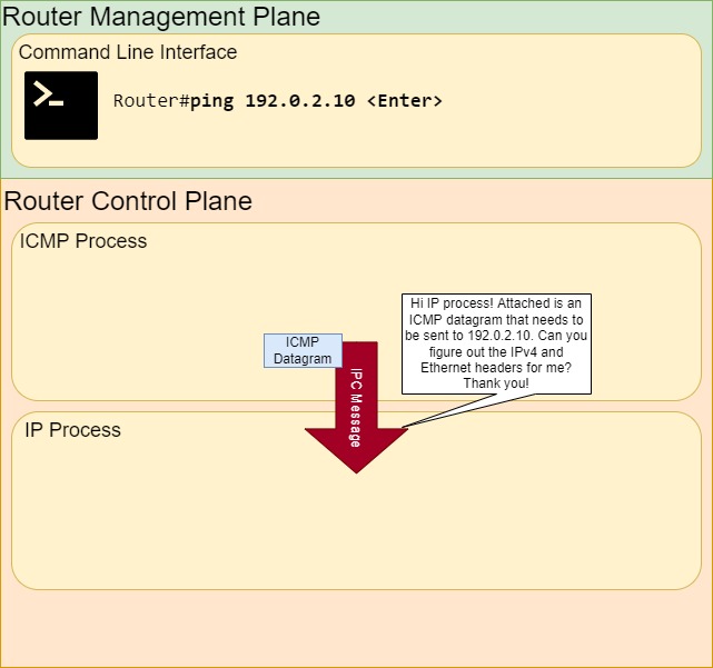 Let’s walk through precisely what happens when the ping 192.0.2.10 command is executed. First, the management plane sends a message through InterProcess Communication (IPC) to a software process of the network operating system responsible for handling the Internet Control Message Protocol (ICMP) for the device. We will refer to this software process as the “ICMP Process”. This IPC message informs the ICMP-related sofware process that the user would like to send ICMP Echo Request packets to a specific IPv4 address.