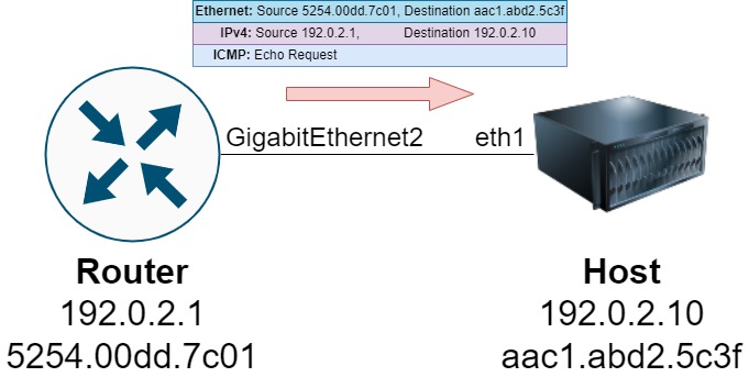 The one fact that the router is currently missing is the destination MAC address of the Ethernet header. This MAC address must be the MAC address assigned to the host’s eth1 network interface, which is aac1.abd2.5c3f as shown through the output of the ip link show eth1 command.