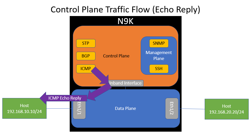When the control plane receives this ICMP Echo Request packet through the inband interface, it will inspect it and “route” it to the ICMP software process so that the ICMP process can handle it accordingly.
