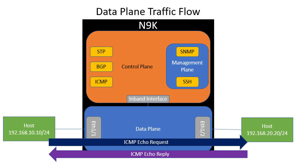 A practical example of control plane traffic in our topology is ICMP traffic destined to the network device itself. If the network device receives an ICMP Echo Request packet destined to an IP address of 192.168.10.1 (which the network device is assigned), the data plane will recognize that the network device itself owns this IP address and forward the packet to the control plane’s inband interface. This action is called a “punt”.