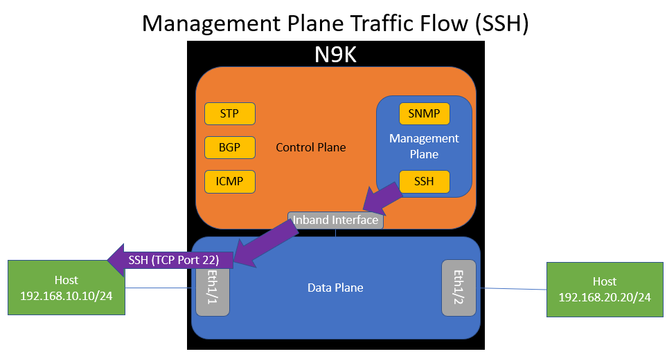 When the control plane receives this SSH packet through the inband interface, it will inspect it and “route” it to the SSH software process so that the SSH process can handle it accordingly.