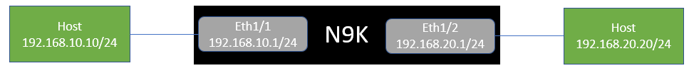 First, let’s take a look at our topology. We have two hosts in different subnets that connect to a Cisco Nexus 9000. One host connects via Ethernet1/1, and the other connects via Ethernet1/2. Ethernet1/1 has an IP of 192.168.10.1, while Ethernet1/2 owns 192.168.20.1.